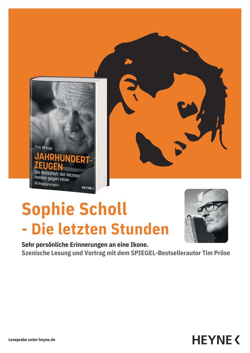 Der SPIEGEL-Bestsellerautor Tim Pröse hat bislang etwa 600 Lesungen aus all seinen Büchern hinter sich, ca. 280 davon an Schulen. Die meisten – und emotionalsten – Auftritte hatte er mit seinem Longseller »Jahrhundertzeugen. Die Botschaft der letzten Helden gegen Hitler«. In ihm porträtiert er 18 Widerstandskämpfer und Überlebende des Naziterrors – allen voran Sophie Scholl. Und weil gerade die besondere Geschichte dieser Heldin so viele Menschen auf seinen Lesereisen tief bewegte, bietet Tim Pröse auch einen szenischen Vortrag und eine Hommage allein an Sophie Scholl an.